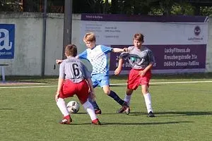 Zum Spiel selber gilt es zu sagen, dass es bereits in den frühen Morgenstunden eine drückende Wärme auf dem Platz herrschte. Bedingungen, die das Fußball spielen natürlich nicht einfacher machte. Wir kamen aber dennoch ganz gut in die Partie. In den ersten Minuten lief der Ball in unseren Reihen und zwangen so den Gegner zu vielen Laufwegen und kurzen Sprints. Aber auch der DSV hatte ordentliche Kicker in ihren Reihen und es entwickelte sich eine gute Partie. Als wir dann in der 6. Minute nach einem eigenen Abstoß das Spiel zügig aufbauen wollten, traf unser junger Keeper Tim Wolsing die Kugel leider nicht richtig und der Ball landete in den Füßen der Gastgeber. Dieser nutzte auch die erste Möglichkeit zur Führung. Jedoch ließen sich unsere Kicker dadurch nicht verunsichern. Als dann 6 Minuten später Hugo Guroll die Pille aus der zweiten Reihe einfach mal auf Tor schoss landete dieser für Außenstehende doch unerwartet in dem selbigen. Der Ball war eigentlich nicht voll getroffen, jedoch blickte der Keeper von Dessau wahrscheinlich in die noch recht tiefstehende Sonne, wobei er sich dann verschätzt haben könnte. Er winkte frühzeitig ab und jeder erwartete das der Ball daneben geht. Als er dann doch im Tor einschlug war der Ausgleichstreffer perfekt. Kurz danach ging es dann in die erste Trinkpause. Nach einer kurzen Erfrischung wurde dann weiter gespielt und bis zur Halbzeit sahen Zuschauer und Trainer ein ausgeglichenes Spiel beim Stand von 1:1.